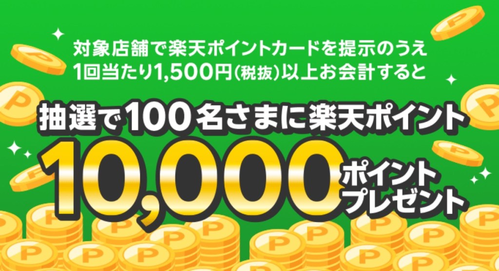 富士薬品グループの対象店舗で、楽天ポイントを1ポイント以上使うだけで10,000ポイントが当たるキャンペーンが始まっています。